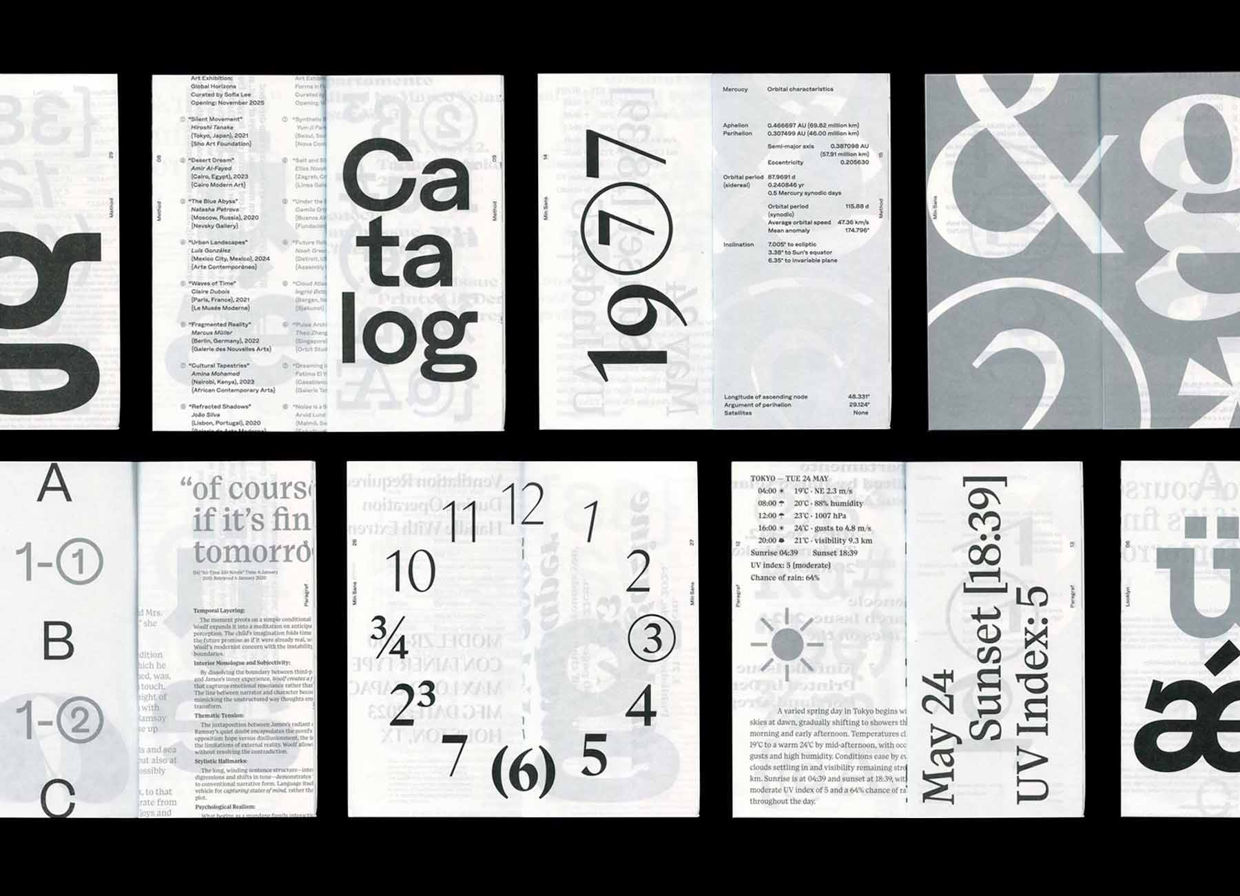 Designed as a compact specimen and reference object, it documents nine type families: Min Sans, Min Sans Stencil, Paragraf, Method, Looklyn, Fig Grotesk, Eliptico, Waverse, and Geotunda.